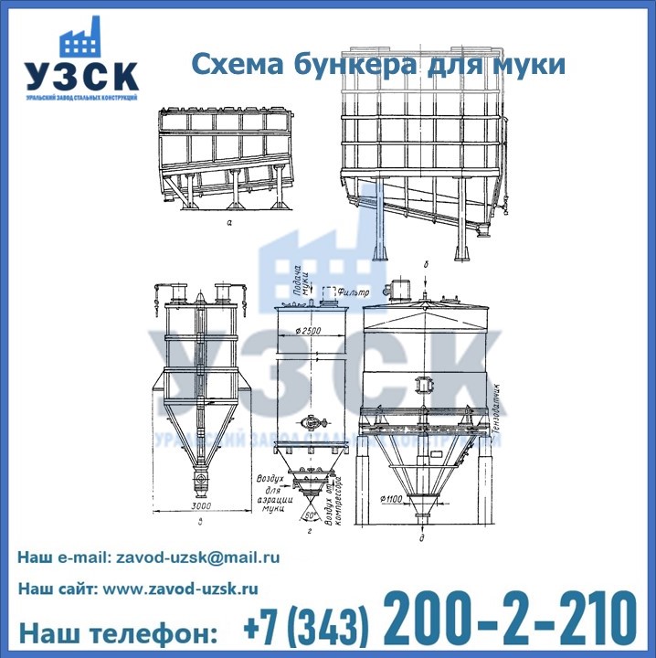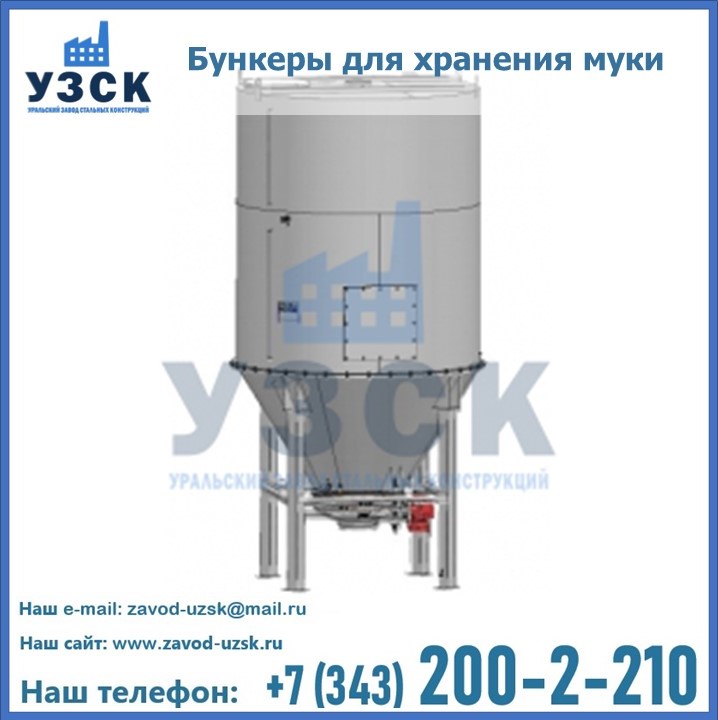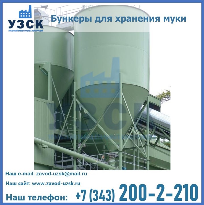 Завод «УЗСК» в Каменске-Уральском проектирует, производит и поставляет целевое оборудование, в том числе, бункеры для хранения муки и прочих сыпучих материалов.