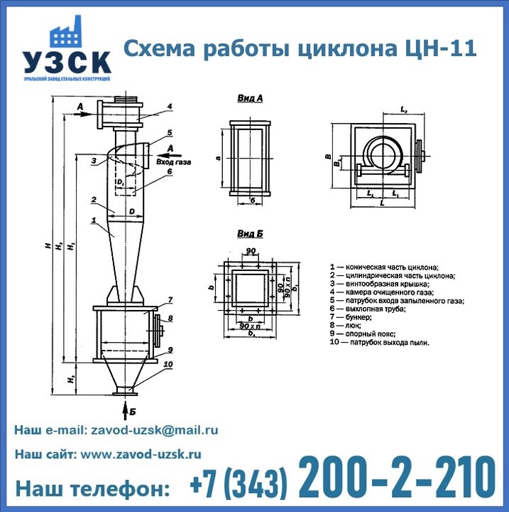 При этом ощутимой разницы в цене между универсальным и узконаправленным, подобранным в соответствии с конкретными техническими требованиями циклоном, нет. Стоимость воздухоочистительного оборудования типа циклон обусловлена маркой и толщиной стали, из которого он изготовлен, сложностью и специфичностью конструкции, наличием дополнительного оснащения (бункер, улитка и другие). При необходимости, на заводе УЗСК в Каменске-Уральском будет изготовлен циклон по индивидуальным техническим чертежам заказчика.