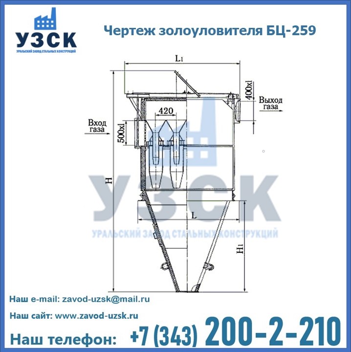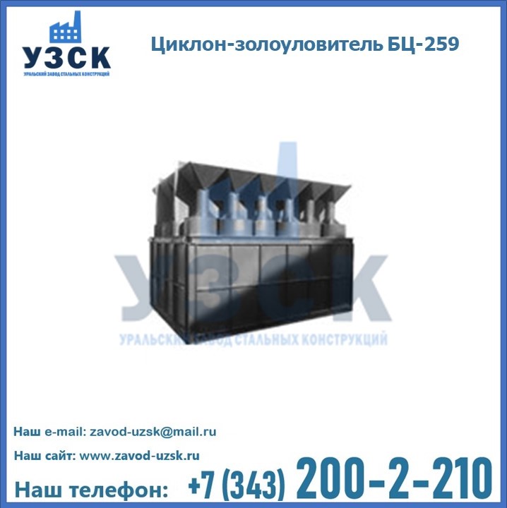 Если вы планируете купить то или иное оборудование, например, циклоны-золоуловители БЦ-259, то рекомендуем заказать данный товар на сайте УЗСК. Мы производим и реализуем продукцию высокого качества по приемлемой цене. Эксперты Уральского Завода Стальных Конструкций в Каменске-Уральском проконсультируют вас по всем вопросам, помогут сделать выбор и оформить заказ без лишних временных затрат. Мы гарантируем соответствие нашей продукции всем требованиям ГОСТ и ТУ, а также износостойкость и высокую производительность предлагаемого оборудования. Если требуется изготовить циклон нестандартных размеров, то такой вариант выполнения заказа тоже предусмотрен, так как предприятие имеет собственные производственные площади и надежных поставщиков. На все поставляемое или производимое оборудование имеются чертежи и прочая техническая документация. Заказать и купить циклоны или прочее оборудование высокого качества и по доступной цене можно через наш сайт или по указанному в разделе «Контакты» телефону.