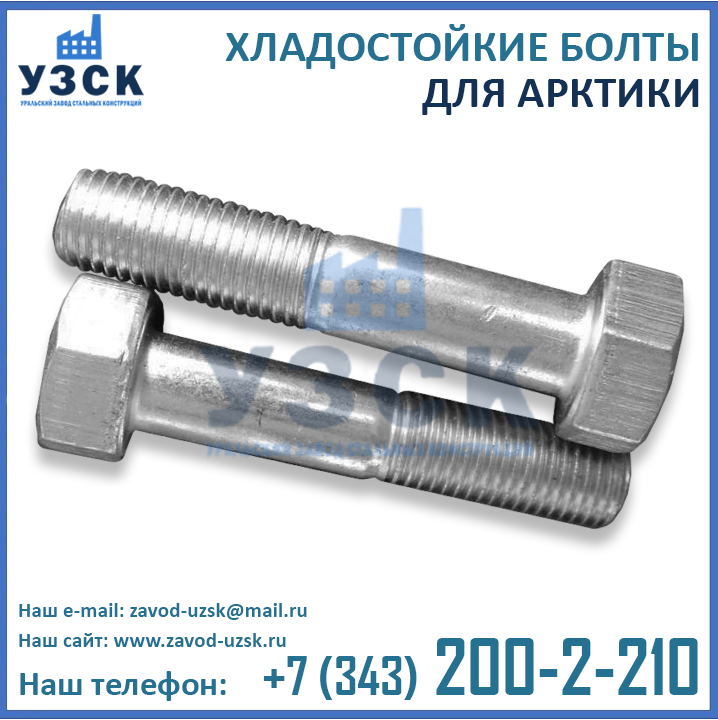 Кроме стандартных болтов по ГОСТ и ОСТ для арктических регионов, завод «УЗСК» осуществляет изготовление хладостойких болтов по индивидуальным размерам и эскизам Заказчика и может разработать конструкторскую документацию и чертежи по ТЗ (техническому заданию) Заказчика, что обусловлено наличием на нашем заводе высокопрофессионального инженерно-конструкторского отдела. Завод «УЗСК» изготовит болты хладостойкие любой длины стержня и резьбы, любого размера и формы головки, из материала, соответствующего климатического исполнения ХЛ.