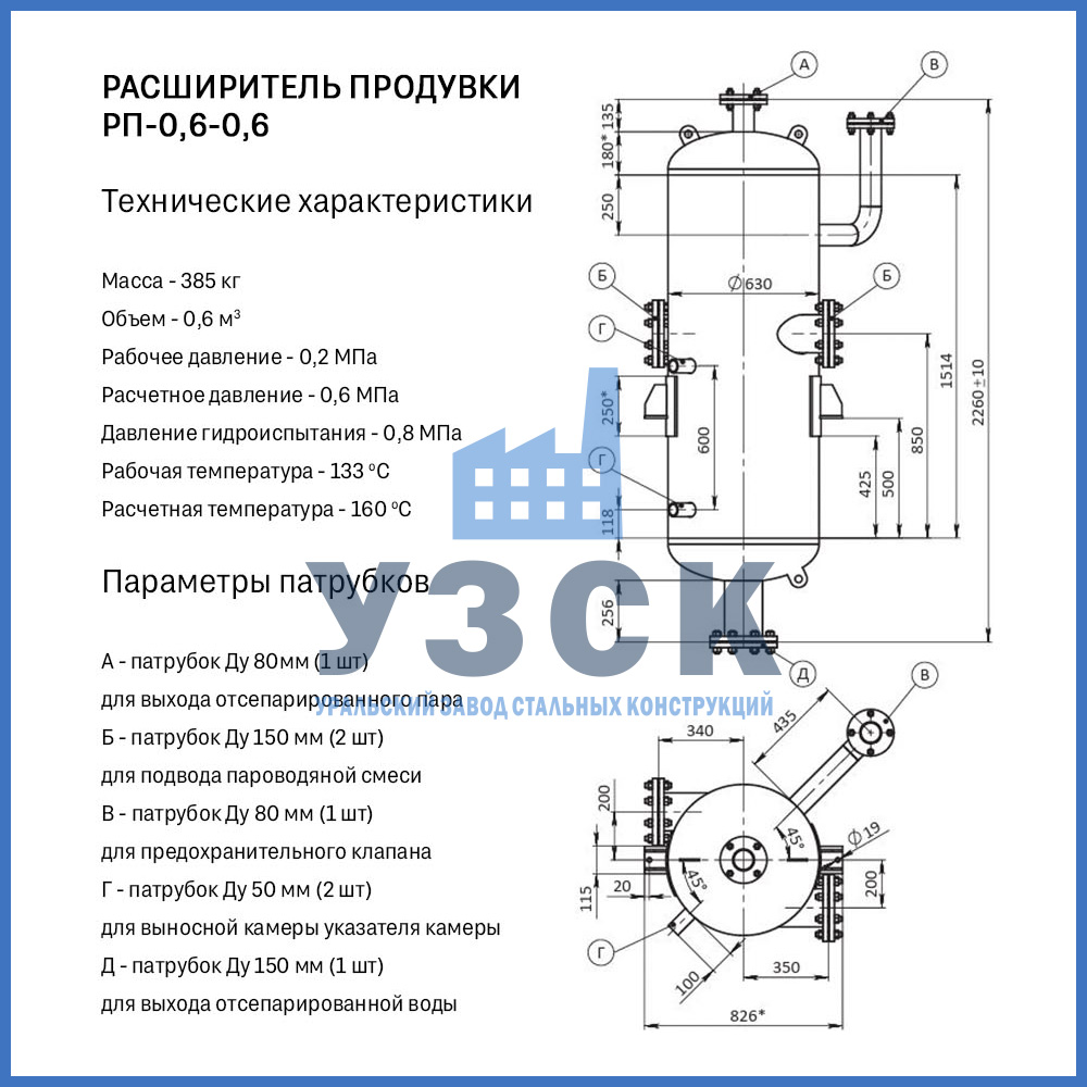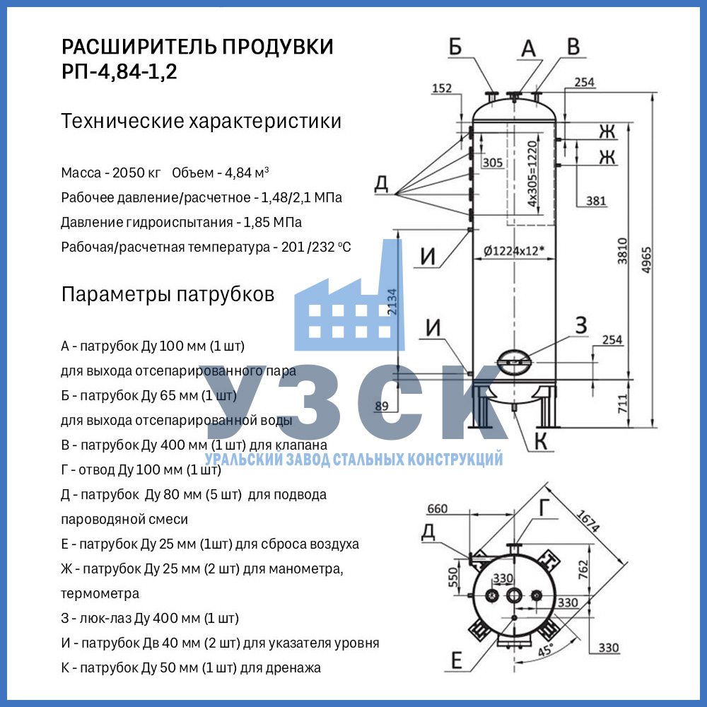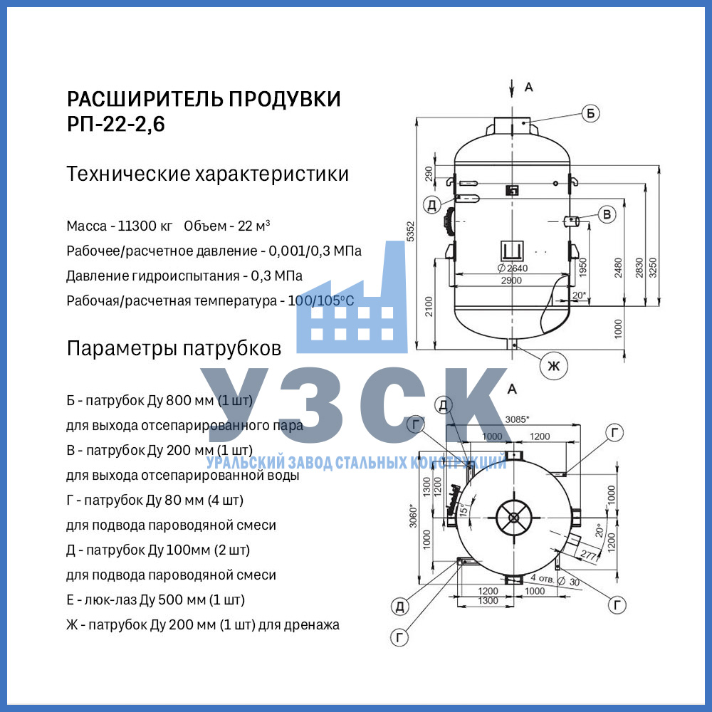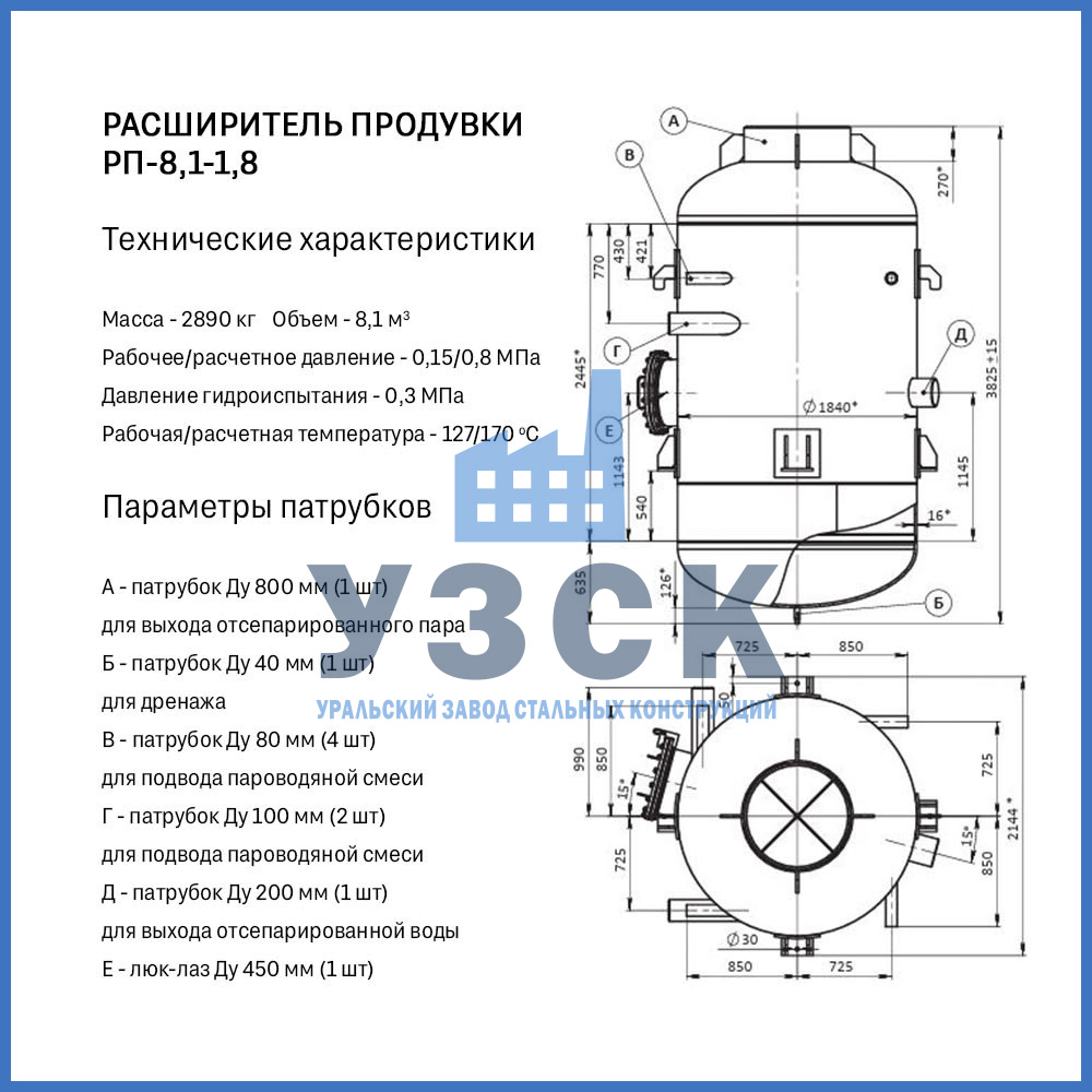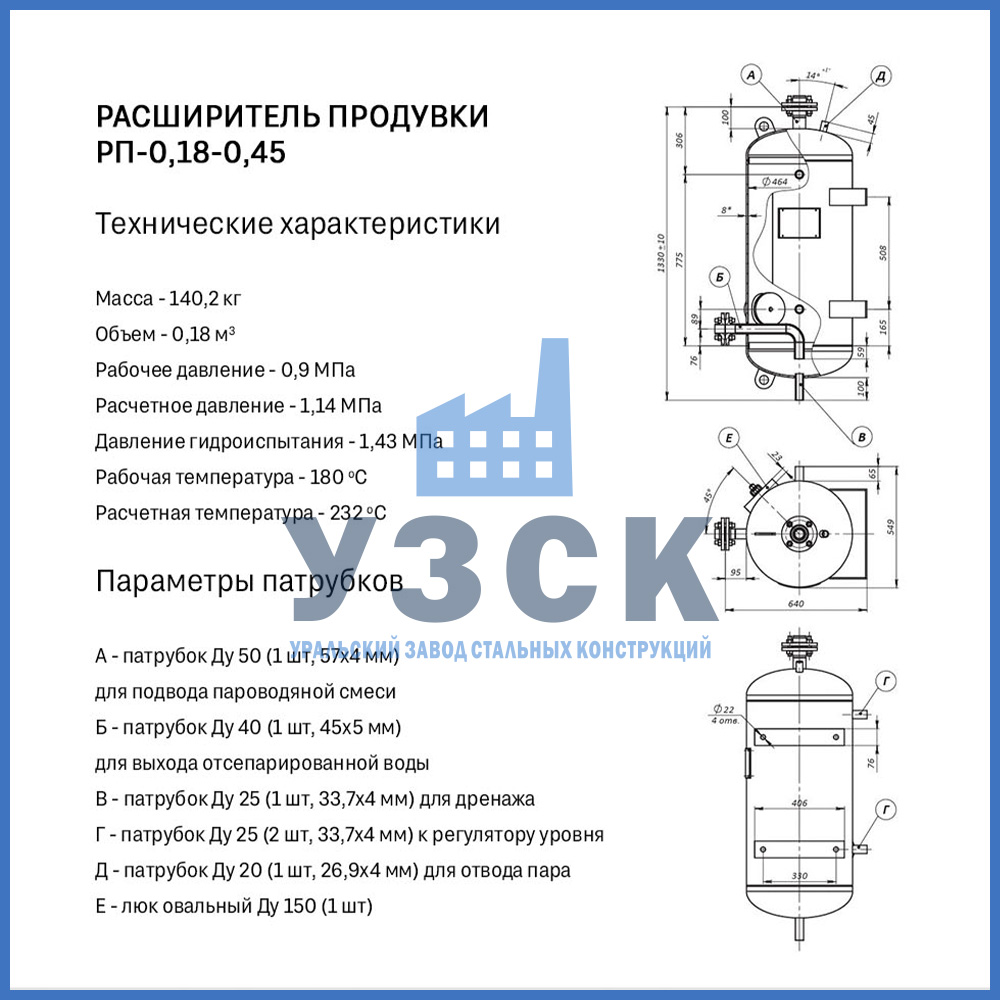 Конструктивно расширитель продувки (РП) — это вертикальный цилиндрический сосуд, изготавливаемый из стальной обечайки с эллиптическими днищами. Стандартная комплектация включает: