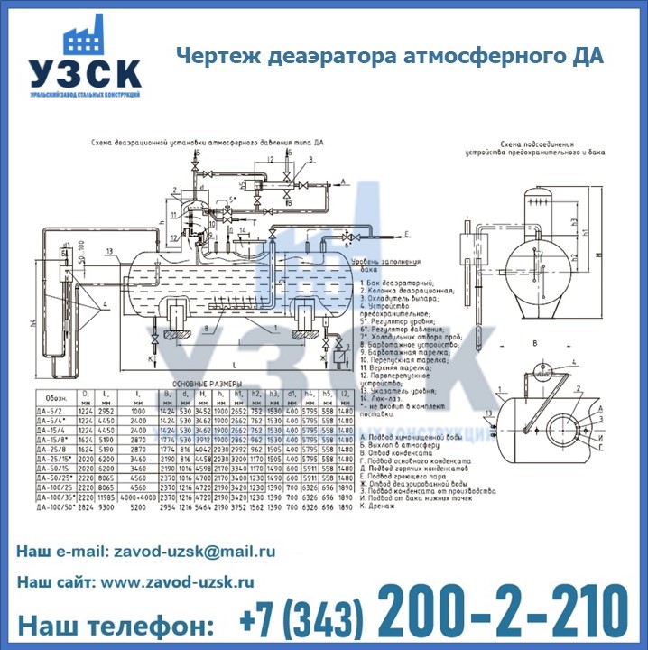 Приобрести качественное оборудование, в том числе, деаэраторы ДА, можно в компании УЗСК в Каменске-Уральском. Мы предлагаем долговечную и надежную продукцию по приемлемой цене. Заказать и купить деаэраторы или другие изделия высокого качества можно через сайт Уральского Завода Стальных Конструкций, или позвонив по указанному в разделе «Контакты» телефону.